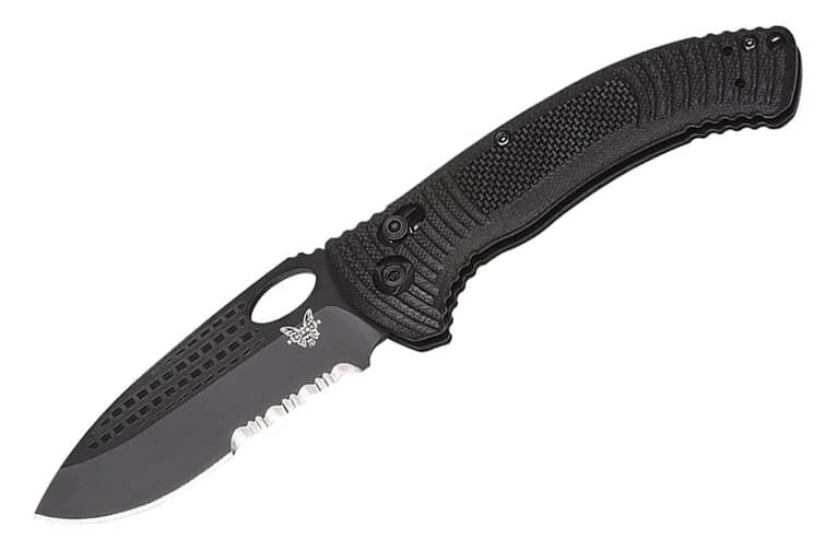 Couteau Benchmade Aileron 737SBK avec lame drop point semi-dentée de 8.8cm en acier CPMS30V (58-60 HRC) avec ouverture d’une main ambidextre par le trou. Gravures au laser sur le haut de la lame. Système d’ouverture et de blocage Axis lock. Manche en G10 noir. Clip deep-carry réversible. Couteau avec longueur totale de 20.4cm. Design Steve Tarani. Benchmade est une des meilleures marques de couteaux industriels sur le marché.