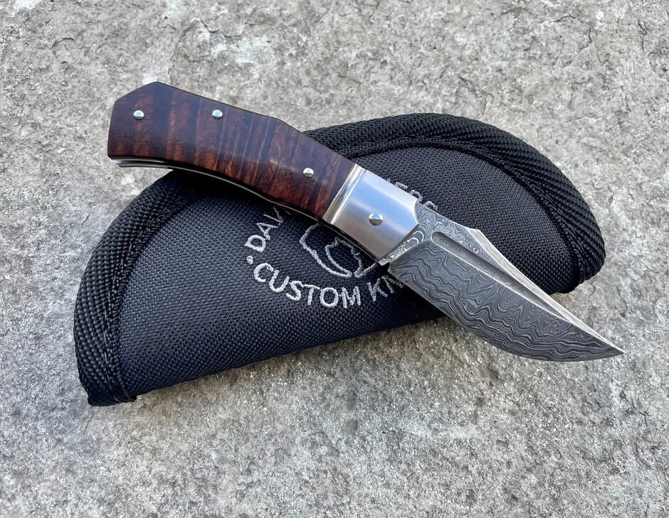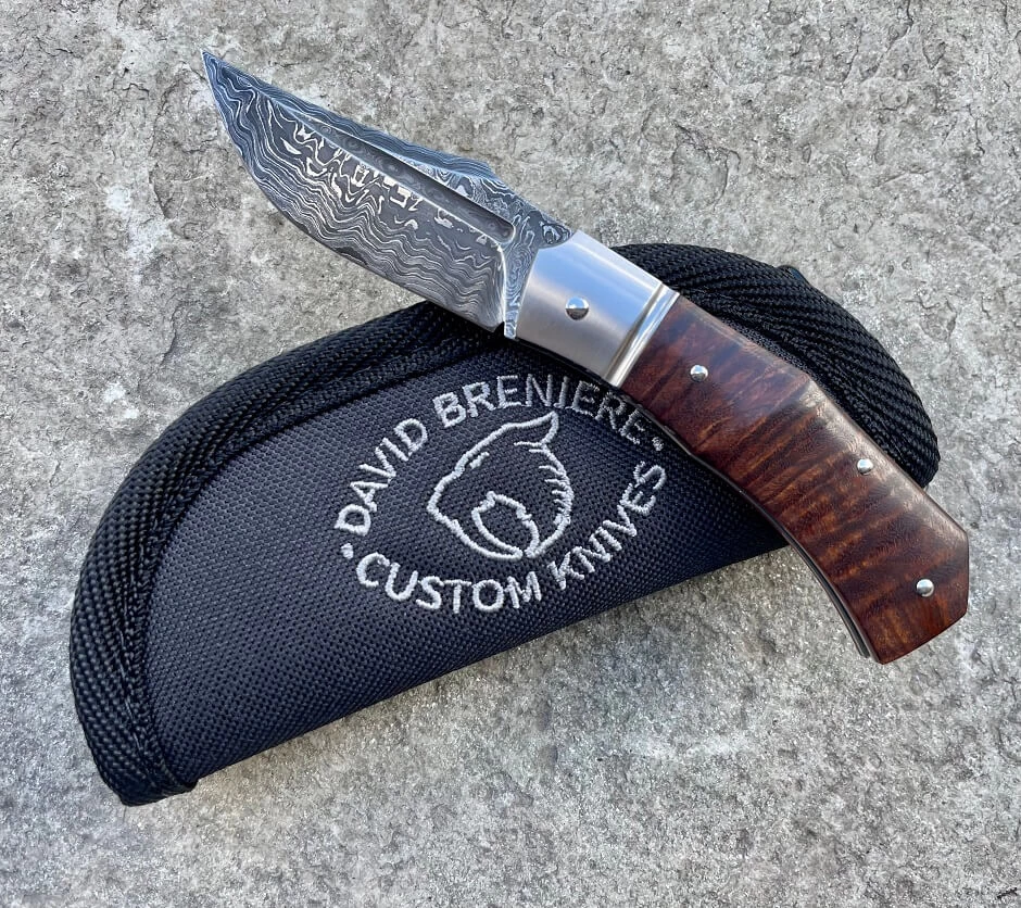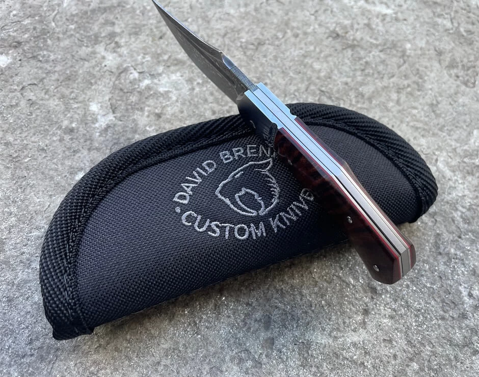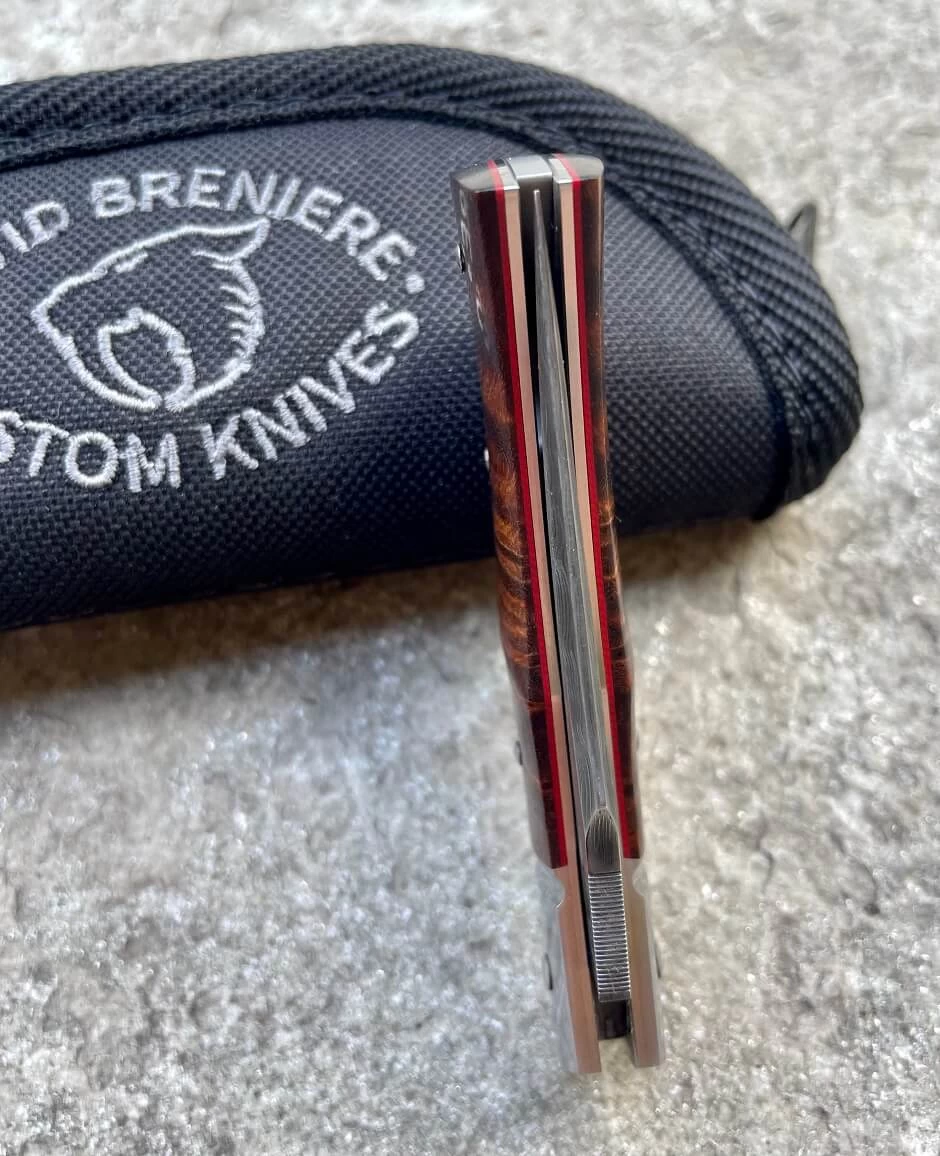 Couteau de David Brenière, modèle Small Inglorious. Lame avec gorge en acier damas feuilleté 80CRV2 de 6.5cm. Manche avec plaquettes en Gidgee et mitres en inox. Cran forcé. Platines et ressort en inox. Longueur totale 15.2cm. Pochette zip avec logo du coutelier. Réalisé par un artisan français recherché par les collectionneurs qui travaille dans la région de Vesoul. RESERVE