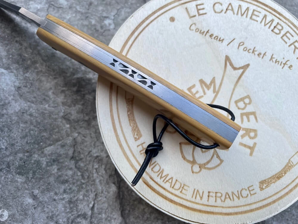 Couteau Camembert buis. Lame de 8.3cm en acier inox satiné 12C27. Plein manche en buis avec rivets en mosaïque. Cran forcé. Platines et ressort en inox. Passe-lacet. Livré sa boîte d’emballage Camembert.