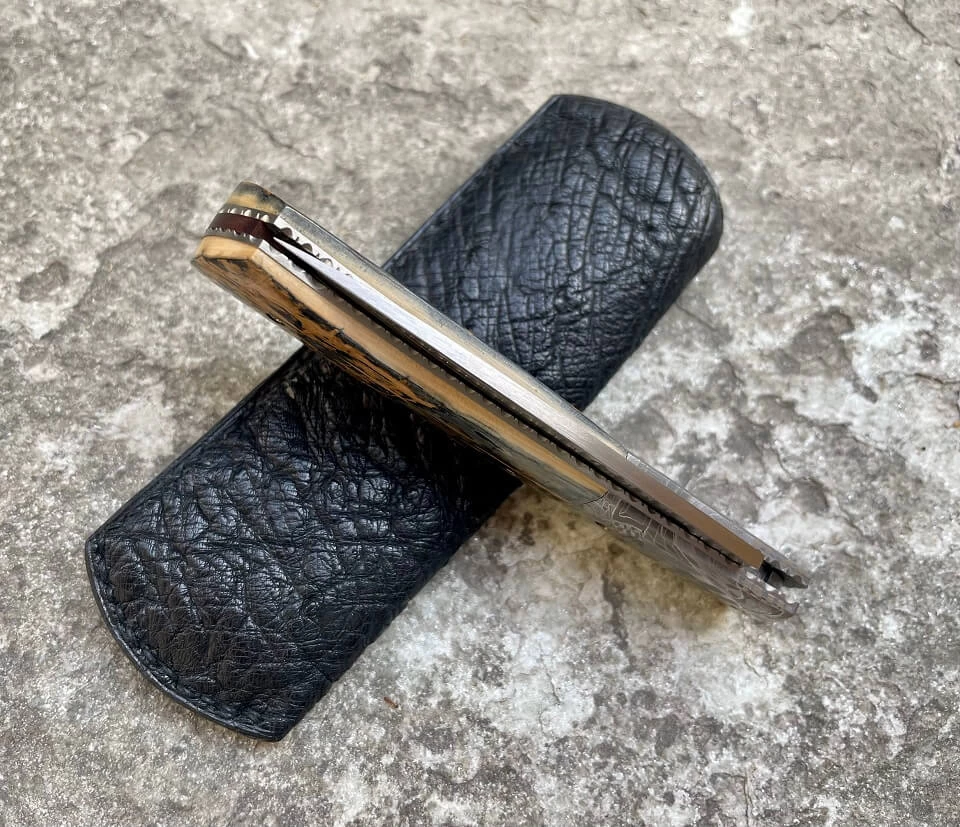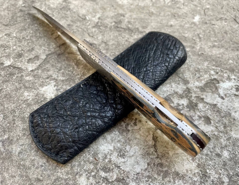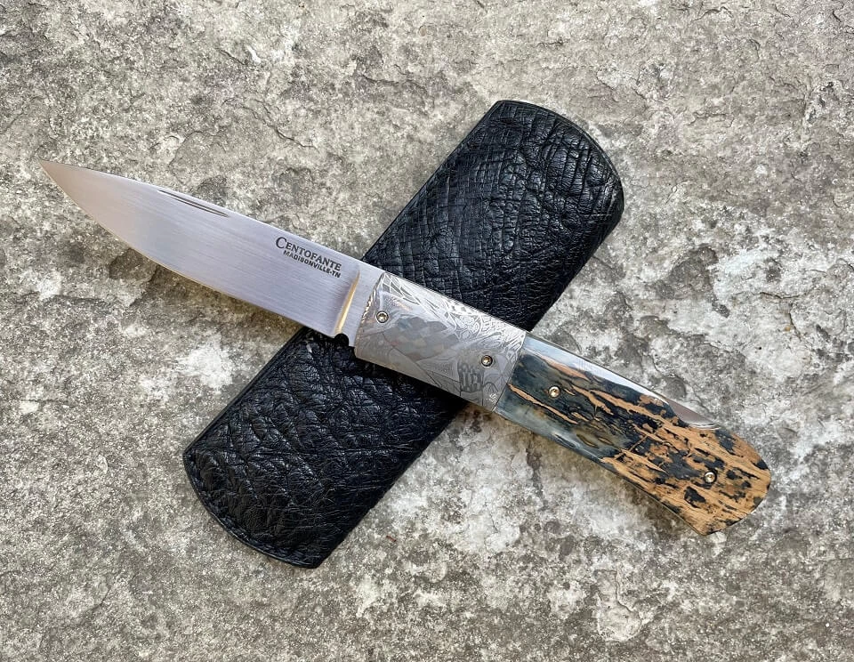 Couteau de Frank Centofante. Lame de 7.3cm en acier ATS34 satinée en long. Mitre en damas mosaïque. Platines guillochées en inox. Plaquettes vissées en ivoire de mammouth. Intercalaire arrière en micarta brun. Cran à pompe. Longueur totale 17.5cm. Superbe couteau réalisé par une des légendes de la coutellerie US du XXème siècle.