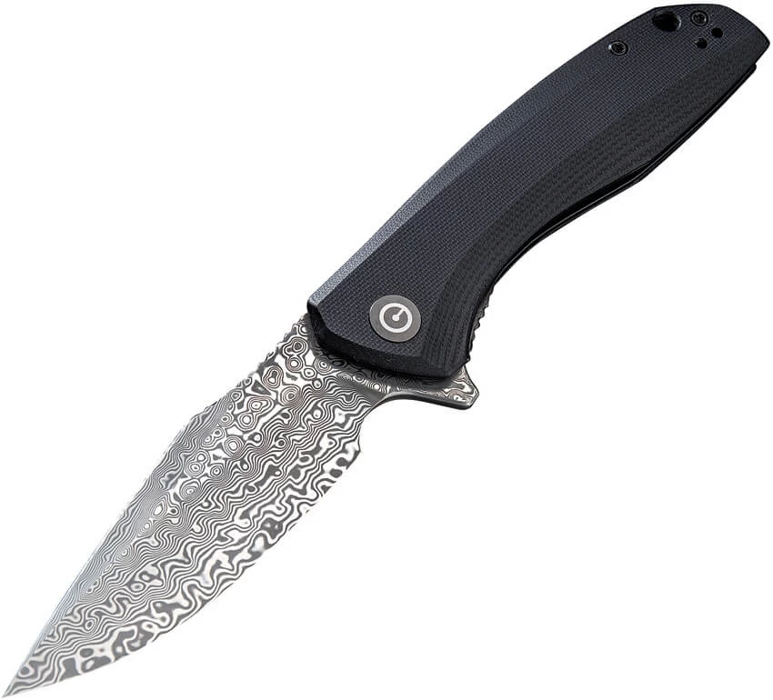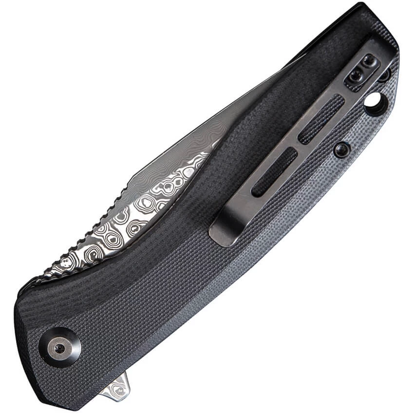 Couteau Civivi Baklash damas Linerlock . Lame en acier damasteel inox de 9cm. Ouverture par flipper. Plaquettes en G-10 noir. Clip. Linerlock. Longueur totale 20.4cm. Livré avec une pochette zip.