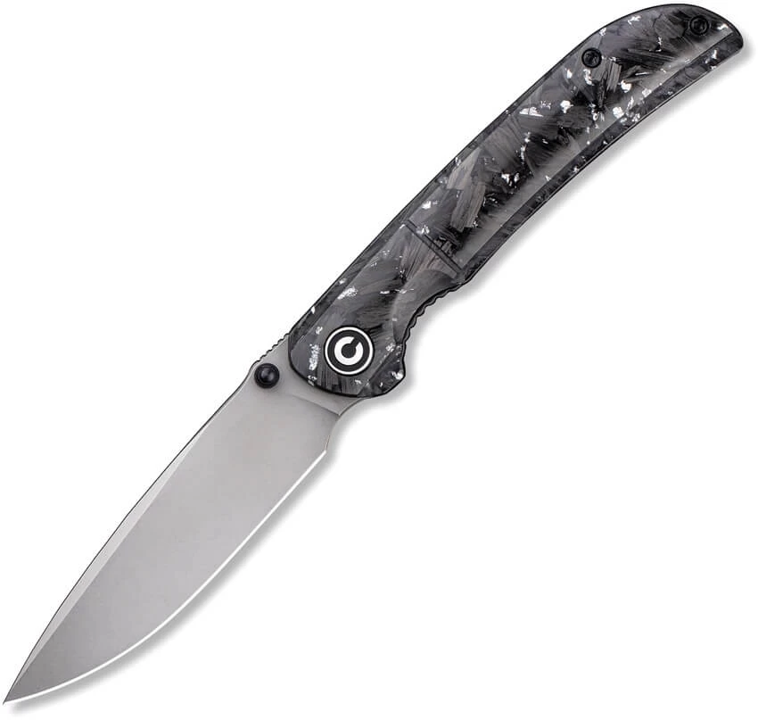 Couteau Civivi Imperium CF. Lame en acier Nitro V finition gris anthracite de 8,9cm. Ergot pour l’ouverture à une main. Clip de poche. Manche en fibre de carbone déchiqueté avec lambeaux d’argent en résine transparente. Longueur totale 19.8cm. Poids 83g. Étui de rangement zip en nylon noir. Livré en boîte.