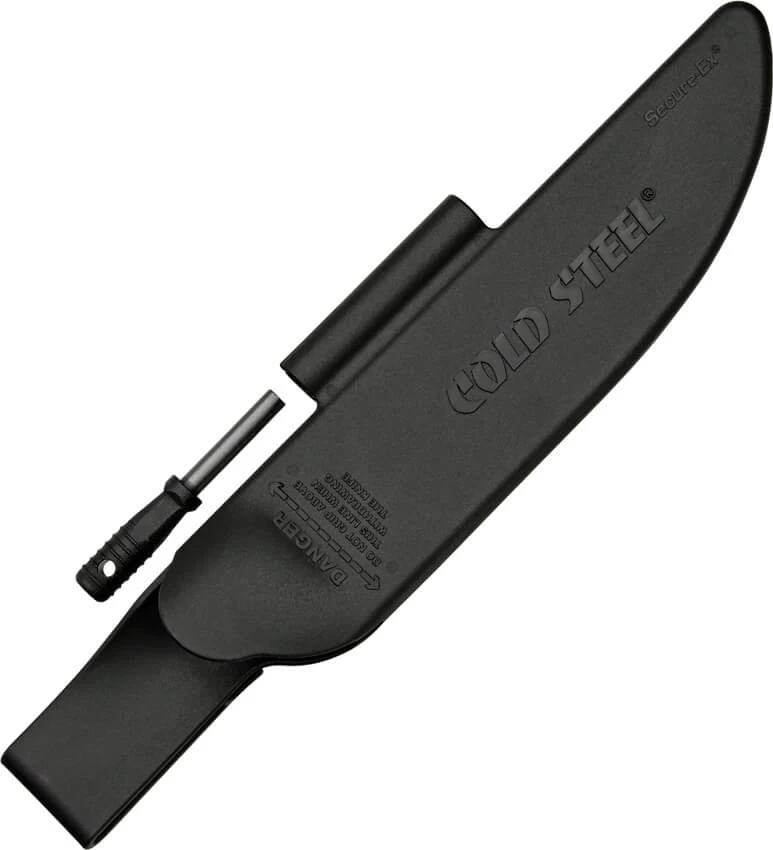 Couteau Cold steel Bushman. Lame en acier carbone SK-5 de 7″ forgée d’une pièce avec le manche creux qui sert à insérer un bâton. Un des couteaux le meilleur marché pour sa solidité en condition outdoor/survie. Etui en Kydex avec firesteel.