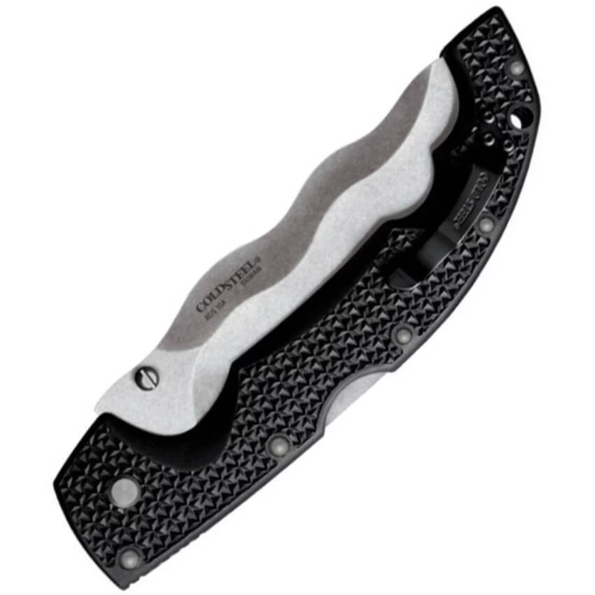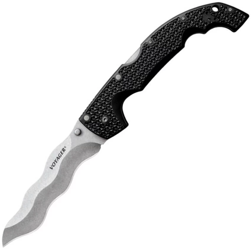 Couteau Cold Steel Kris Voyager. Lame kriss de 14cm !. en acier inox AUS-10A avec finition stonewash. Poignée noire Griv-Ex. Autres informations: Ergot pour une ouverture par un droitier. Clip. Longueur totale 31.15cm. Cran à pompe. Grand couteau.