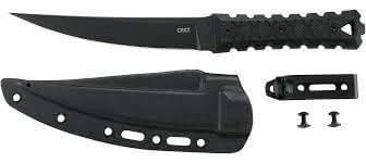 Couteau CRKT HZ6 CR2927. Longueur totale 28,58 cm. Lame en acier au carbone SK5 enduite de poudre noire de 16,5 cm. Manche en G10 noir. Pleine soie. Trou pour une lanière. Lame de style Hira-zukuri. Fourreau de ceinture en Boltaron noir. Conçu par James Williams. Livré enn boîte.