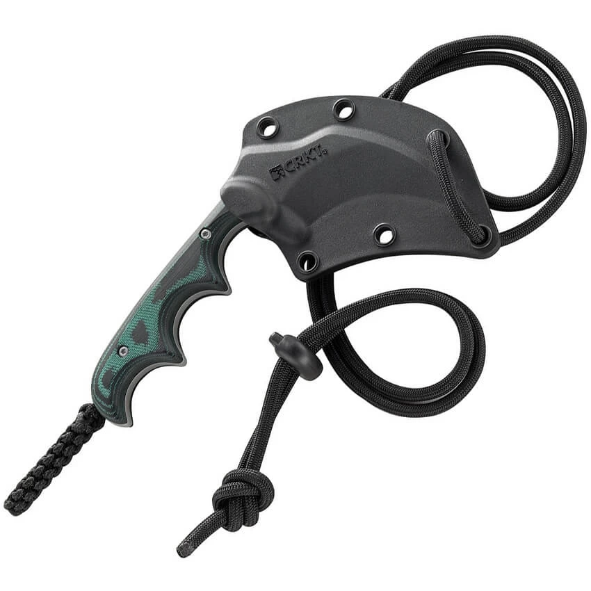 Couteau CRKT Keramin Minimalist. Couteau de cou avec lame hawkbill de 5cm en acier. 5CR15Mov et plaquettes en micarta vert/noir. Etui en GRN. Lanyard. Longueur totale 12.2cm.