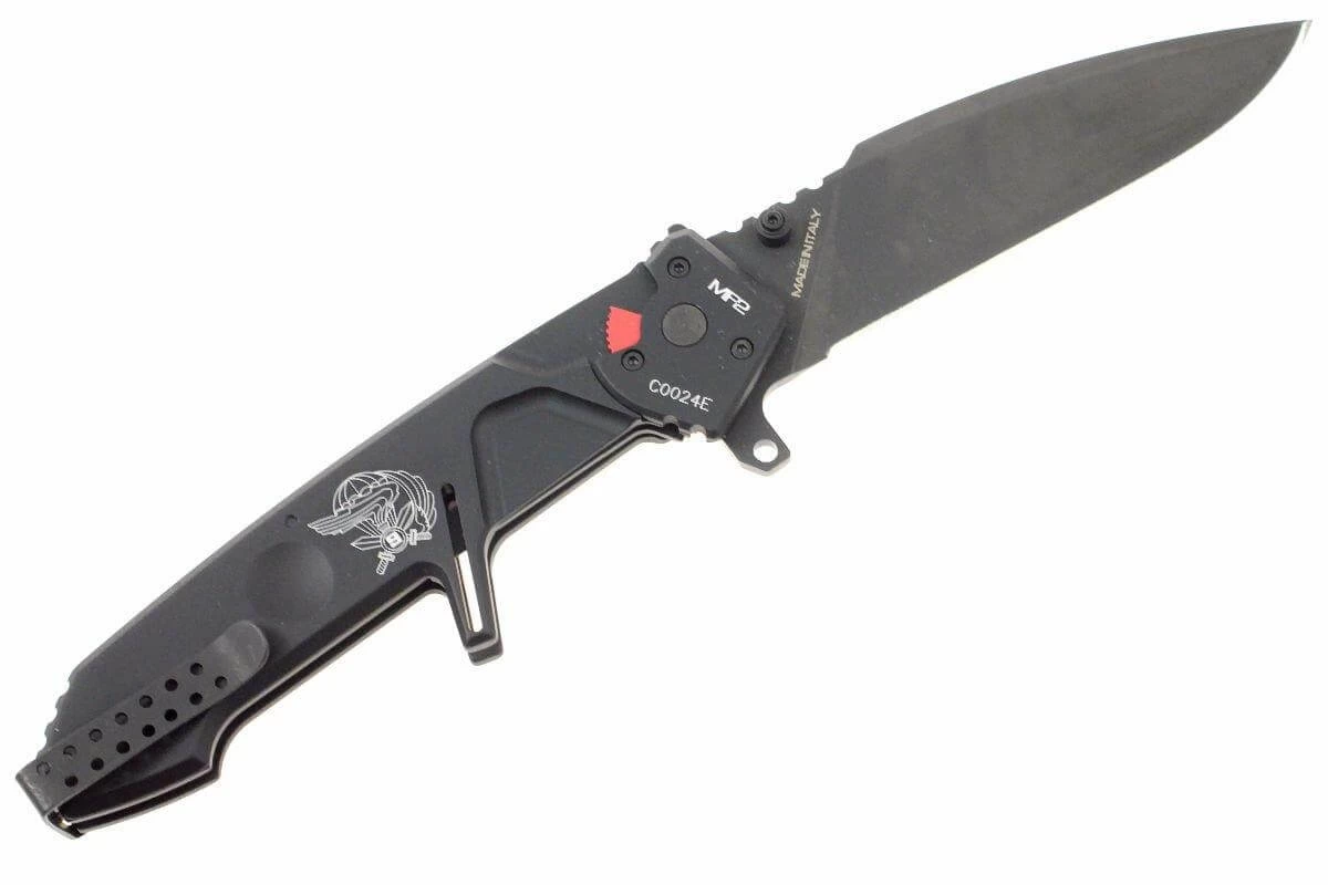 Couteau Extrema ratio MF2 Ordinanza Col Moschin. Lame avec coating noir anodisé de 11.2cm en acier Bohler N690Co (HRC 58). Epaisseur 4mm. Ouverture par les ergots D/G et par flipper. Double quillon pour une protection de la main optimale. Manche anticorodal avec logo imprimé. Cran liner lock avec bouton complémentaire de sécurité. Clip inox. Pommeau brise-vitres. Longueur totale 26.5cm. Poids 195g. Commandé et adopté par le Neuvième Rgt. parachutiste “Col. Moschin”. Livré en coffert.