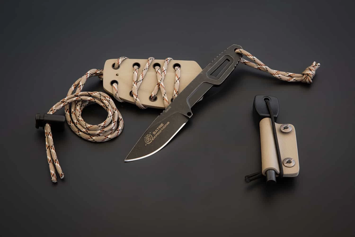 Couteau squelette avec lame de 6.8cm et longueur totale de 16.2cm. Etui kydex avec paracorde pour le porter au cou. Fire steel à fixer sur l’étui.
