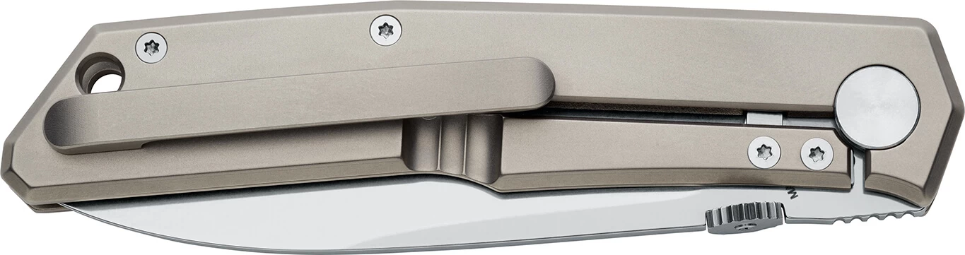 Lame de 8.5cm en acier inox N690Co finition stonewash avec ergots D/G pour l’ouverture ambidextre. Manche en titane « bead blasted », cran framelock intrégré dans le manche. Clip titane. Longueur totale 20cm. Poids 85g.