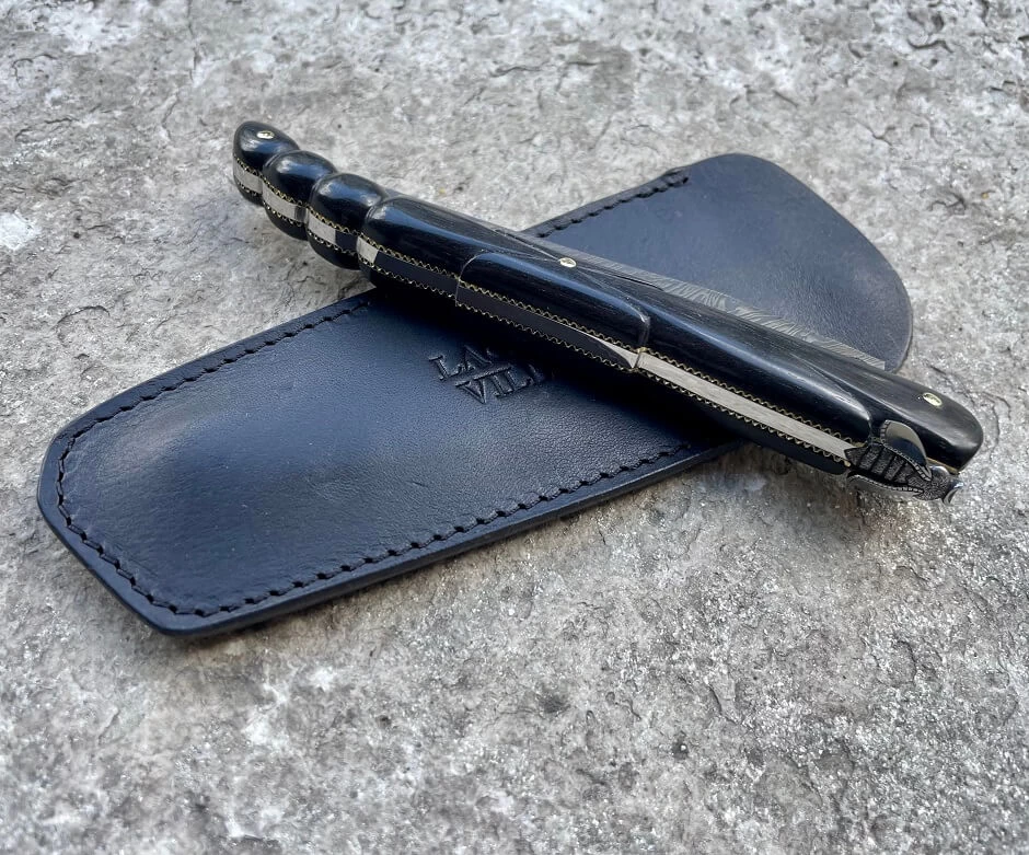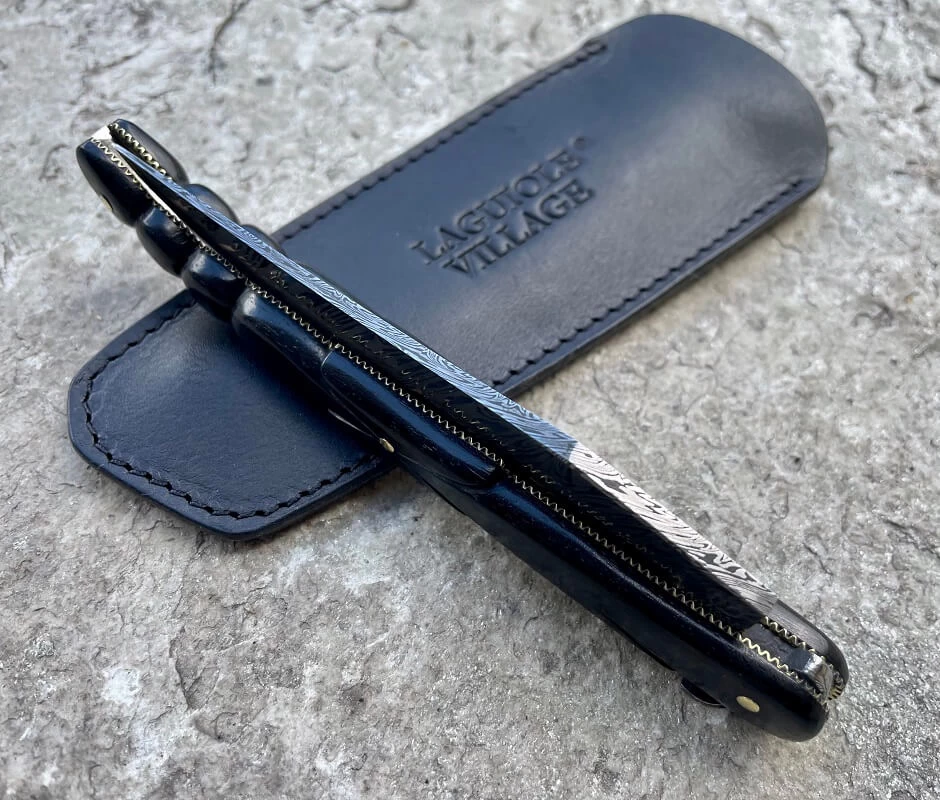 Couteau Laguiole 13cm. aile de pigeon réalisé par Mickael Ginisty. Lame de 11cm. en acier damas carbone. Manche sculpté en forme d’aile de pigeon en bois d’ébène. Platines guillochées en laiton. Ressort et mouche (en forme d’abeille) guillochés à la main. Cran forcé. Longueur totale 24cm. Production en Aveyron par Laguiole Village.