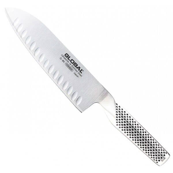 Couteau Global G-80 avec lame de 18cm alvéolée en acier Cromova 18 inox (56-58 HRC). Couteau à légumes Santoku.