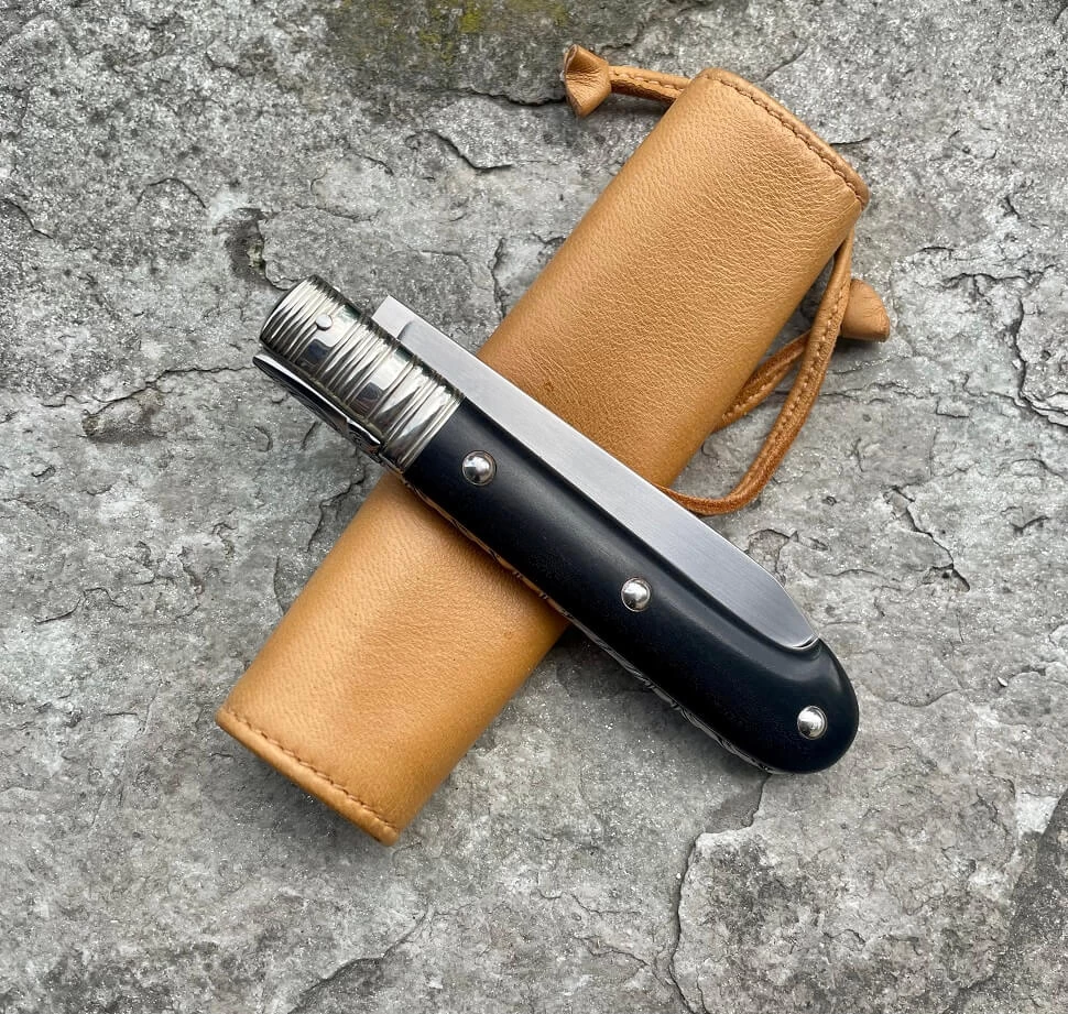 Couteau de Pascal et Isabelle Graveline, modèle Némours. Lame de 10.2cm en acier RWL34 avec gravure sur le dos. Manche avec plaquettes en ébène rivées. Plaquette en argent à graver côté recto. Ressort forgé entièrement gravé à la main par Isabelle. Mitre centrale en maillechort. Cran forcé. Longueur totale 22.3cm. Poids 100g. Couteau réalisé par un MOF (meilleur ouvrier de France), l’atelier Graveline fait partie des membres des grands ateliers de France et est considérée comme entreprise du patrimoine vivant.