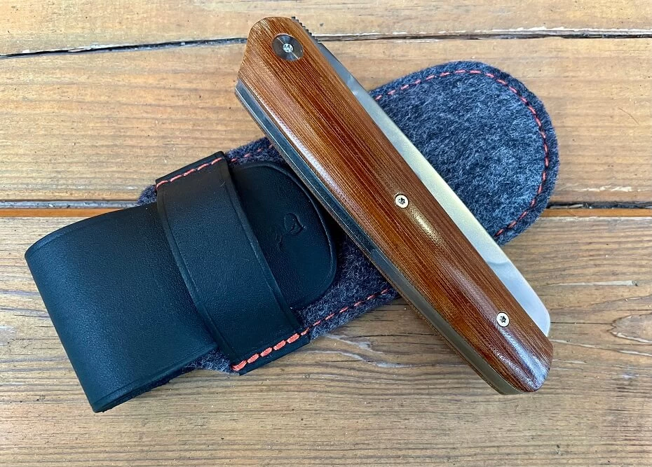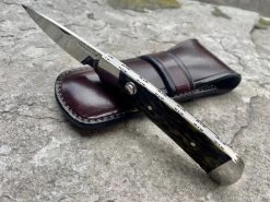 Grini Michel modèle K-Ravage. Lame montée sur roulement à billes de 9.3cm en acier carbone XC100 avec trempe sélective. Plaquettes en micarta brun vintage. Platines et intercalaire en titane. Liner lock. Longueur totale 20.7cm. Poids 99g. Etui en cuir avec rabat pour la poche. Michel possède son atelier dans les Vosges.