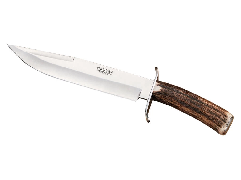 Lame en acier inox 440 de 20.5cm. Garde en S. Manche en bois de cerf. Etui cuir de ceinture marron. Fabriqué en Espagne.