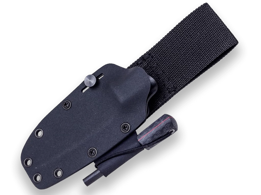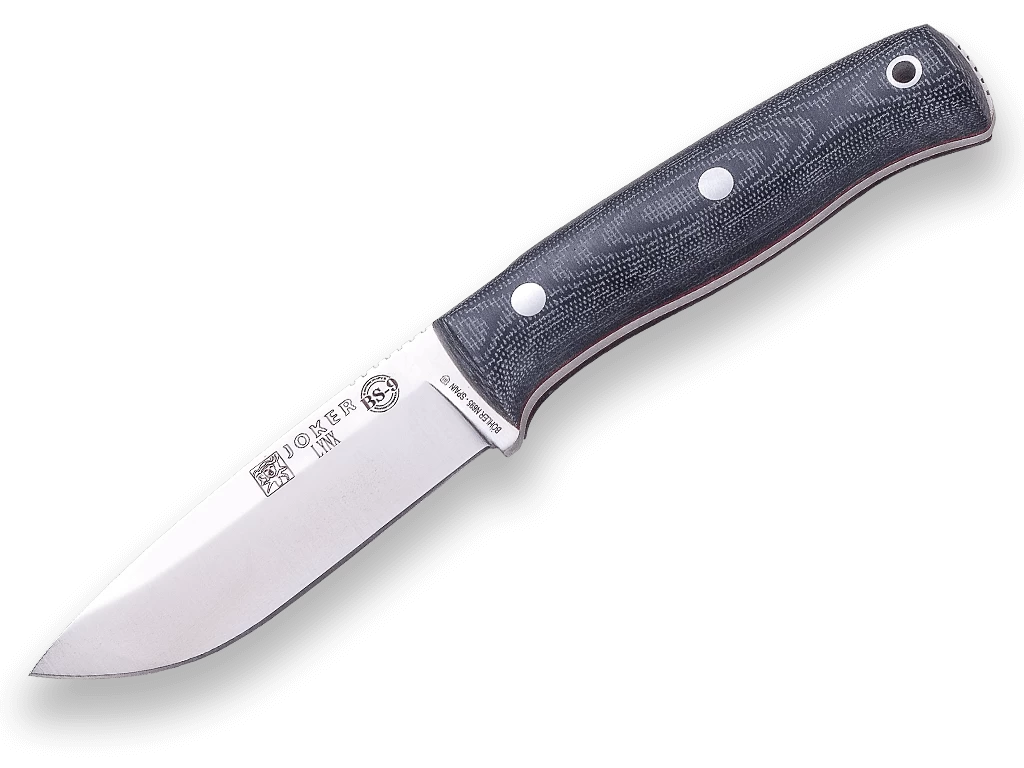 Joker couteau Bushcraft BS9 Lynx micarta avec lame full tang en acier inoxydable Böhler N695 de 110mm, épaisseur 4mm. Longueur totale: 230 mm. Poignée en micarta vert avec intercalaires en fibre rouge. Poids: 158 grs. Etui en kydex avec bouton de sécurité et emplacement pour firesteel avec poignée en plastique noir. Fabriqué en Espagne.