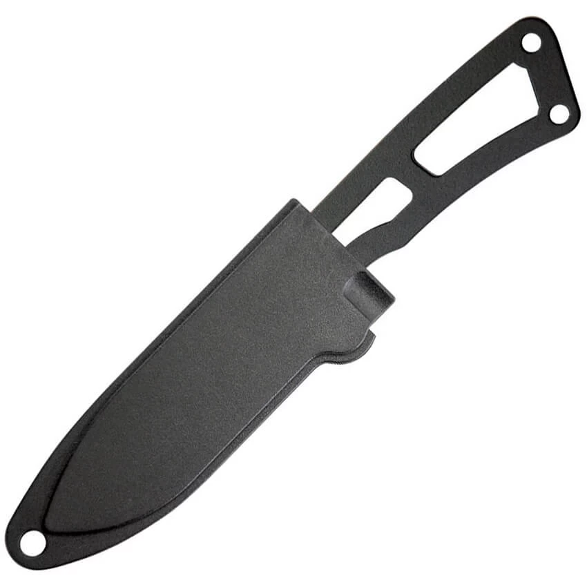 Couteau Ka-Bar Becker Remora BK13. Lame drop point de 5.5cm en acier inoxydable 440 avec coating noir. Poignée noire. Construction monobloc. Gaine de cou en plastique moulé noir. Longueur totale 13cm. Livré en blister. Attention, couteau de petite taille.