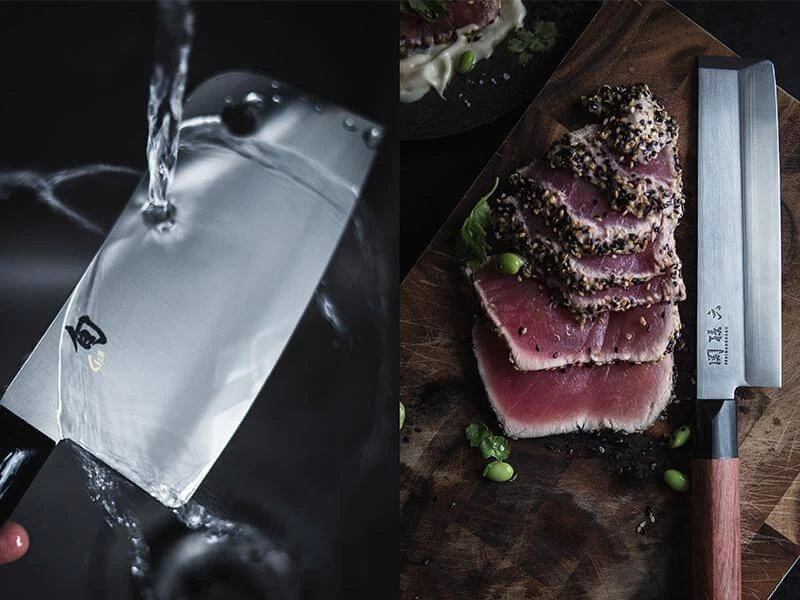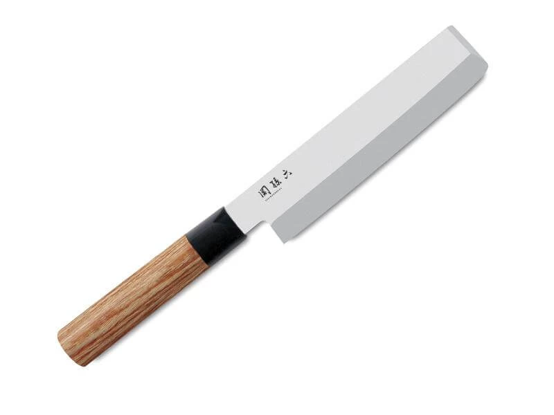 Couteau traditionnel japonais produit depuis des siècles sous la même forme. Seules certaines lames, de type européen, ont été ajoutées à cette série. La lame est en acier inox avec une dureté Rockwell de 58 +/- 1. Le manche est en bois de séquoia dur et oléagineux (d’où sa résistance à l’eau). La virole, en polypropylène noir poli, est en harmonie avec la couleur moderne du bois.