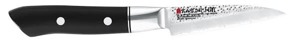 Lame en acier damas VG-10 cobalt high carbon (60 HRC) de 9cm. La partie martelée est en acier inox 410. Manche en résine polyactel (POM) qui respecte les normes de confort et d’hygiène, ainsi qu’une durabilité excellente. Fabriqué au Japon selon des critères haut de gamme. Couteau d’office.