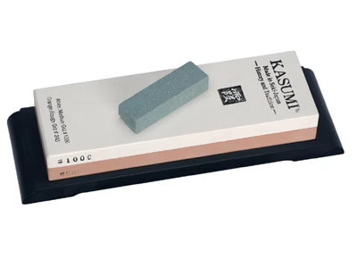 Pierre à eau du Japon. 18.4cmx6.2cm. 2 grains (240 et 1000). Support pour la pierre.