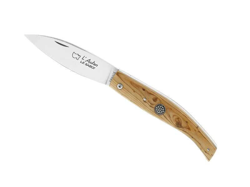 Couteau L’Autan au Sabot Genévrier et Médaillon. Cran forcé. Lame acier inox 12C27 de 9cm, plein manche 11 cm en genévrier avec médaillon « croix Occitane ».Longueur totale 20.1cm.