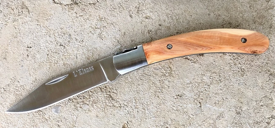 Couteau l’Elsass avec lame de 9.1cm en acier inox. Manche en genévrier, mitre inox. Cran forcé. Dans le prolongement du ressort, mouche avec la décoration de la cigogne symbole de la région de l’Alsace. Couteau traditionnel made in France.