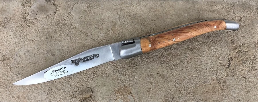 Laguiole en Aubrac 10cm fermé avec lame satinée de 8.5cm en acier inox 12C27. 2 mitres inox satinées. Ressort forgé. Plaquettes en cade (bois de genévrier). Cran forcé. Production en zone Laguiole.
