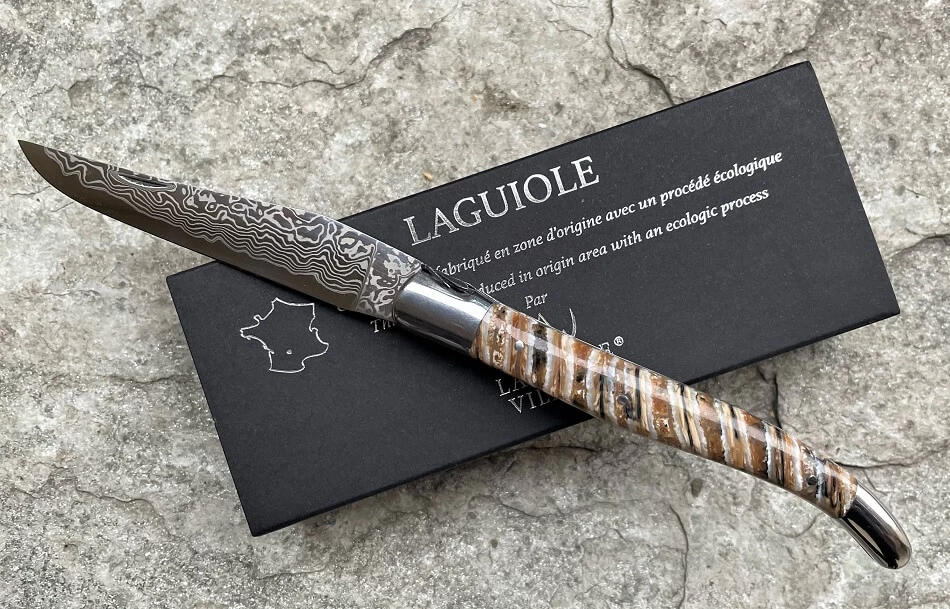 Couteau Laguiole Village artisanal. Lame de 10cm en acier damas japonais inox finition polie. Mitres en inox. Manche avec plaquettes en molaire de mammouth marron. Ressort et platines guillochés et mouche ciselée à la main. Cran forcé. Couteau signé par l’artisan Mickael Ginisty sur le talon du ressort. Etui pour la poche. Certificat.