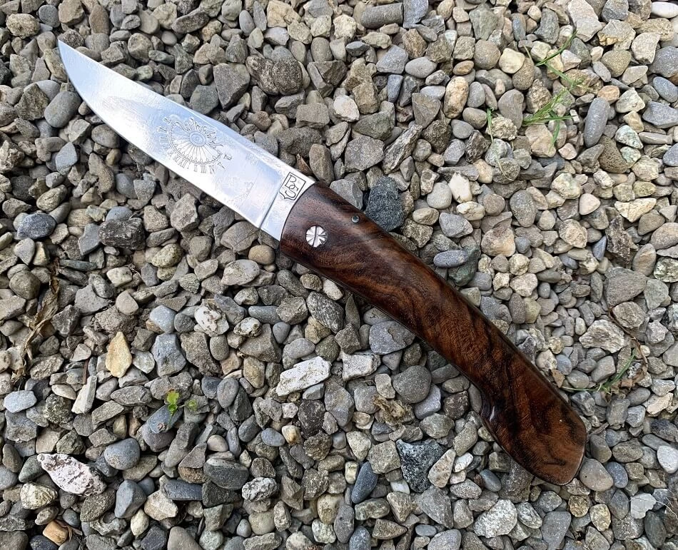 Couteau Le Montagnard. Lame en acier carbone XC75 de 8.9cm décorée d’un cadran solaire forgé. Manche en noyer de collection (Milan). Système 2 clous (axe avec une vis). Environ 40g. Fabriqué à la main par Sylvain Brunet, artisan coutelier.