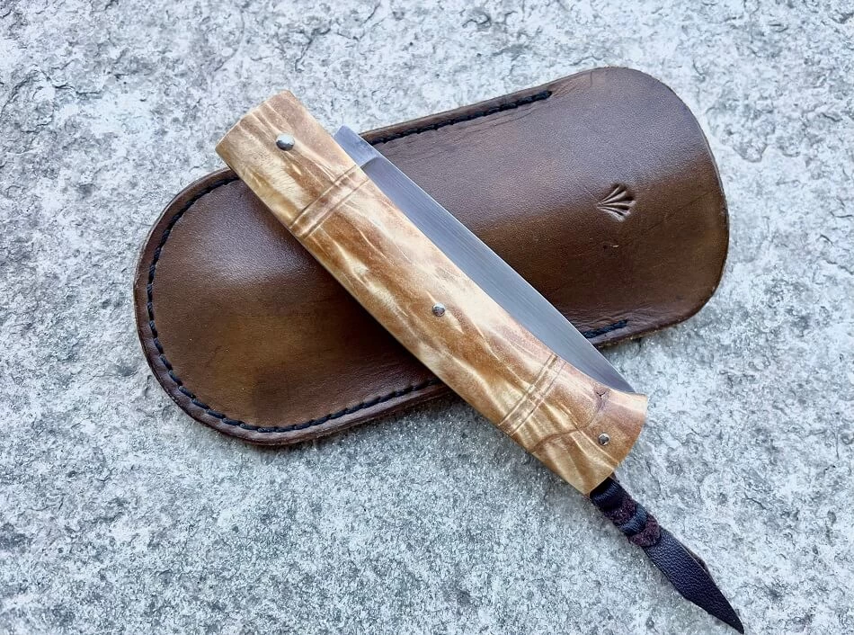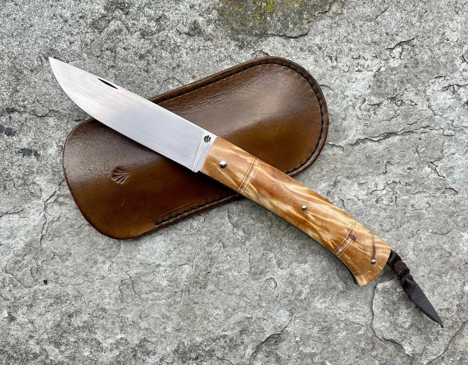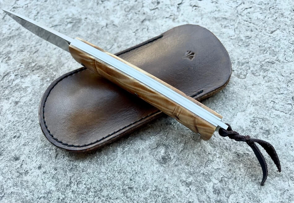Couteau Forestier de Philippe Lemonnier. Lame satinée en acier inox RWL34 de 8.5cm. Plein manche avec plaquettes rivées en loupe de peuplier stabilité. Ressort et platines en inox. Cran à pompe caché actionné par la bélière. Longueur totale 19cm. Réalisé par un artisan thiernois qui a collaboré notamment avec Raphaël Durand.