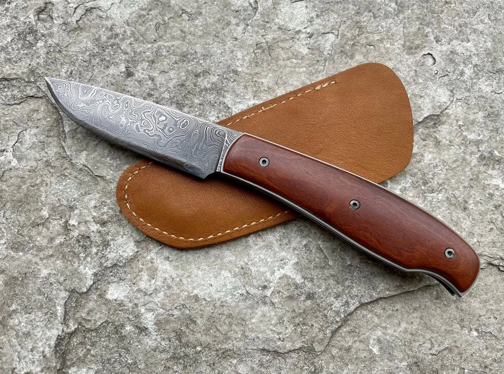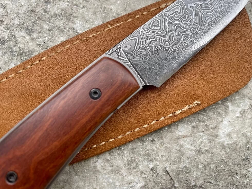 Couteau de David Lespect. Lame en damas 300 couches 90MCV8/15n20 de 8.3cm. Manche avec plaquettes en jujubier. Platines en titane grade 5 avec cran liner intégré. Entretoise. Longueur totale 19.3cm. 100g. Production de David datant d’une dizaine d’année. Couteau de collection. VENDU