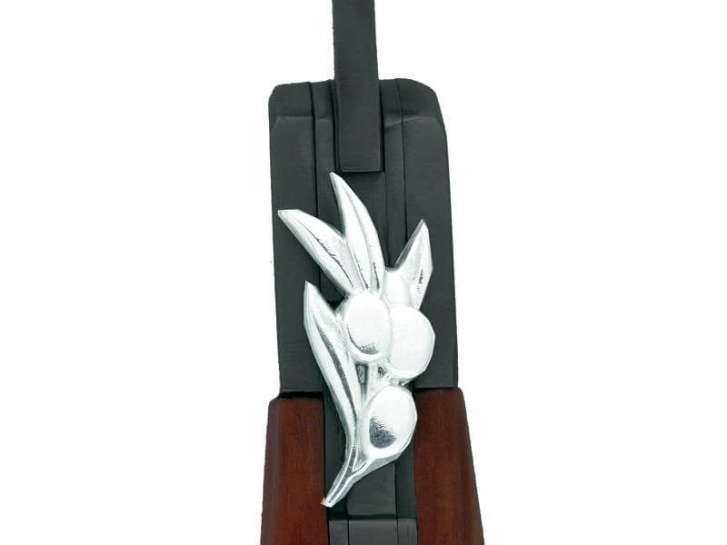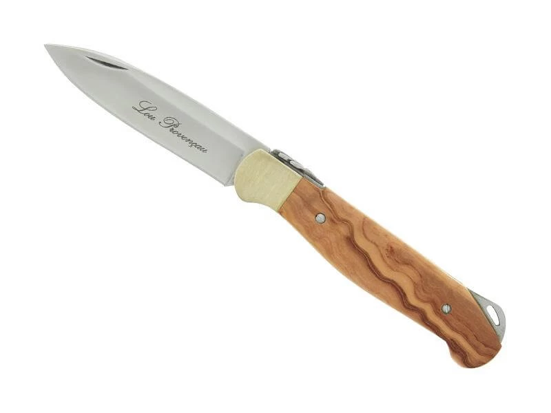 Couteau Lou Provencau olivier. Lame de 8cm en acier inox Z100. Manche de 11 cm en olivier, ressort guilloché avec rameau d’olivier, mitres en maillechort. Cran forcé. Passe-lacet.