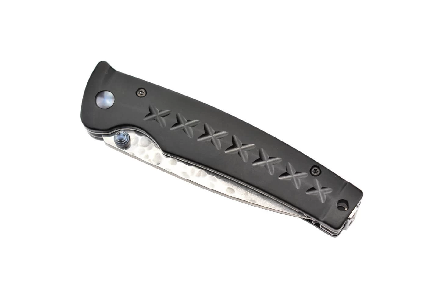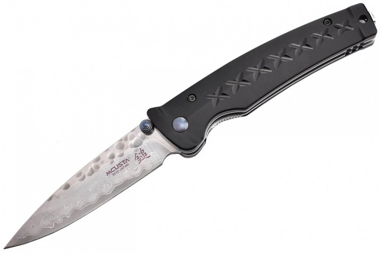 M-Custa Tsuchi Black avec lame martelée sur le haut de 8.4cm en acier damas 33 couches avec au centre un noyau en VG10 (HCR 59-60), ergot pour l’ouverture ambidxstre anodisé. Vis anodisée. Manche en alu texturé. Liner lock. Clip. Longueur totale 19.1cm. Poids 99g. Produit à Seki au Japon. Un produit élégant avec une belle réalisation.