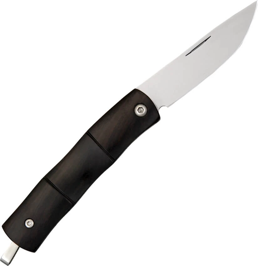 Couteau M-Custa. Lame de 6cm en acier aus-8. Cran forcé. Couteau avec côté recto en bois foncé (pakkawood). Côté verso en acier (clip). Longueur totale 13.8cm. Usage de pince à billets. Bélière.