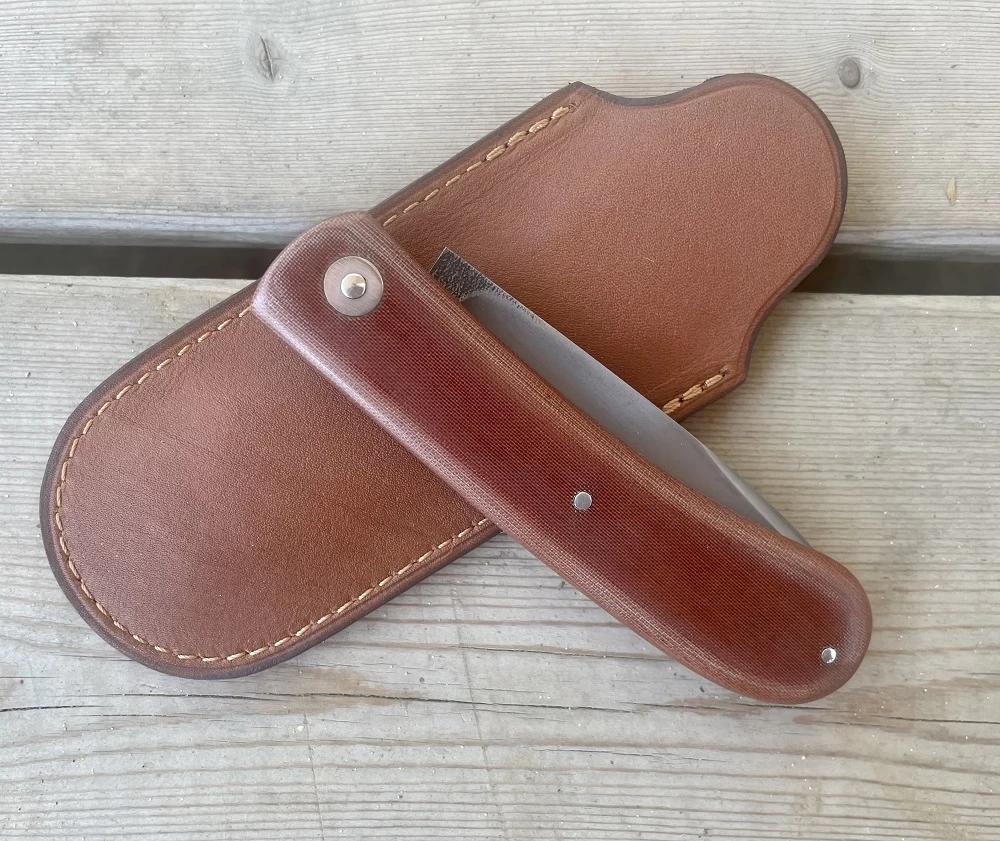 Couteau de Frédéric Maschio, modèle Canif. Lame en acier carbone 90VCV8 de 8.2cm avec onglet. Manche avec plaquettes en céleron brun. Cran forcé carré. Ressort et platines en acier inox. Longueur totale 19.2cm. Produit par un artisan de la région de l’Ain dans le Bugey.