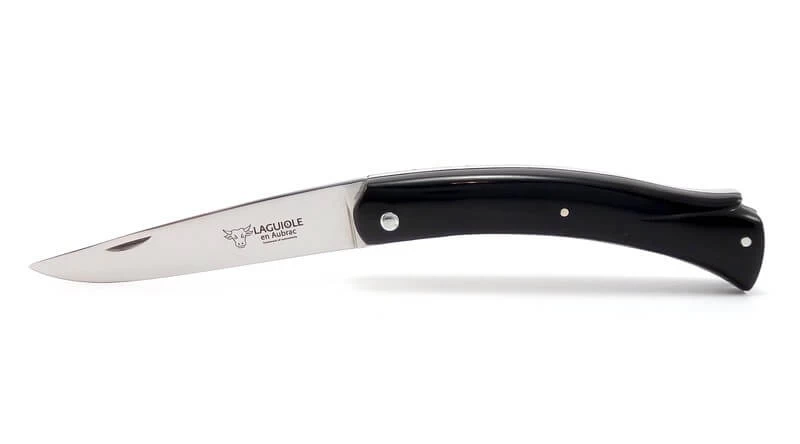 Lame polie en acier inox 12C27. Manche en corne de buffle. Mitres et platines en inox. Cran forcé. Couteau de 11cm fermé.