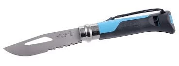 Opinel Numéro 8 avec lame semi-dentée de 8.5cm en acier inox 12C27 partiellement crantée. Manche en bi-matière résistant à des températures extrêmes (-40 à +80) pour une utilisation sportive (voile, montagne…). Sifflet intégré et blocage de lame Virobloc.