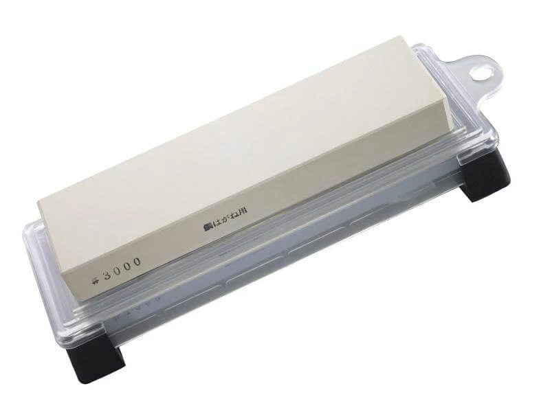 Pierre à aiguiser japonaise 1000-3000. Pierre à eau japonaise 2 grains.[bleu : gros grain (1000), ivoire : grain moyen (3000)], sur socle.