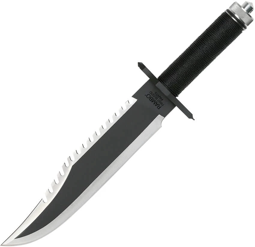Couteau Bowie avec accessoires dans le manche. Réplique du film Rambo 2 avec Sylvester Stallone. Lame inox, étui cuir. Longueur totale 40cm.