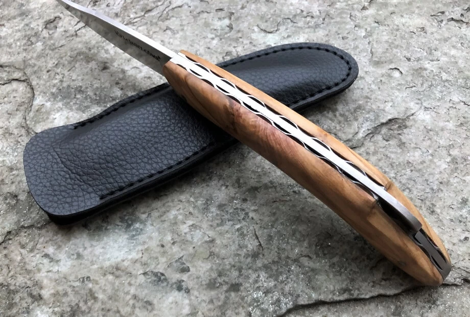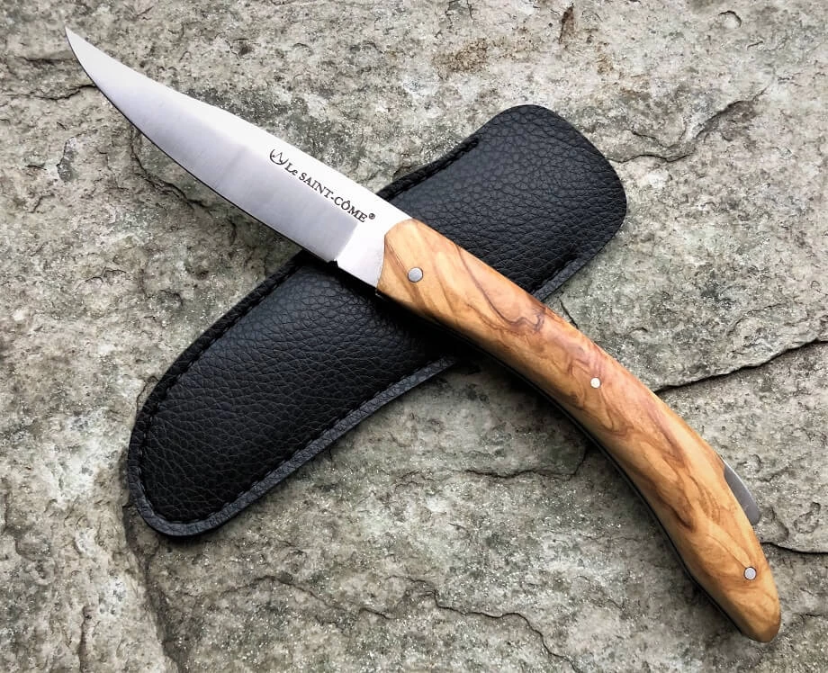 Couteau Saint-Côme Laguiole Village olivier. Lame de 10cm en acier inox 12C27, plein manche de 12 cm en olivier. Cran à pompe. Platines guillochées. Couteau de la région de l’Aubrac. La lame est inspirée du clocher de Saint-Côme, ville étape du chemin de Compostelle.