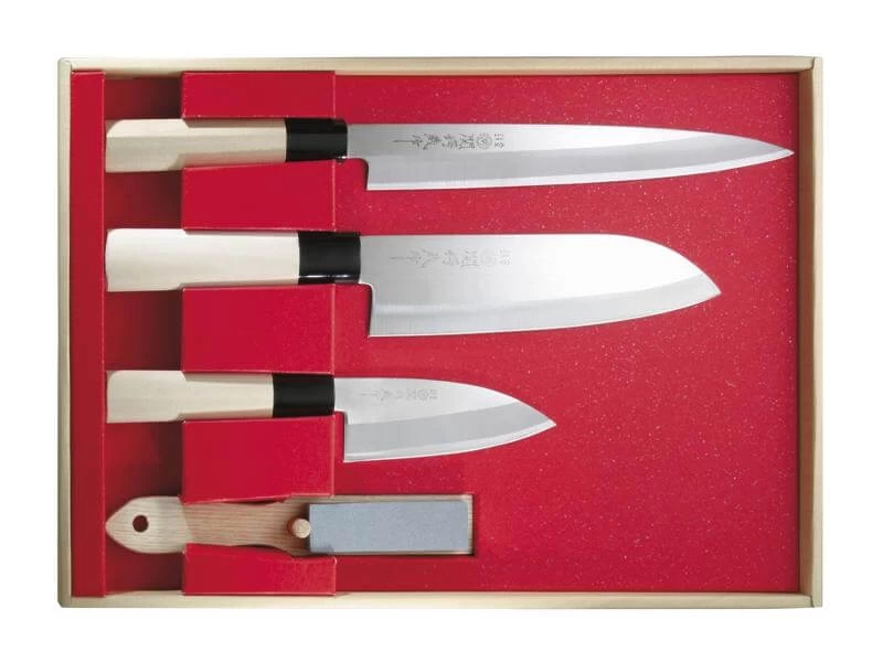 Set de 3 couteaux de cuisine japonais. Coffret cadeau avec : Sashimi lame inox 420J2 de 21cm (poids 75g.), Kodeba lame de 11cm. (97g.), Santoku lame de 17cm. (122g.) et pierre Ă aiguiser. Uniquement pour droitier.