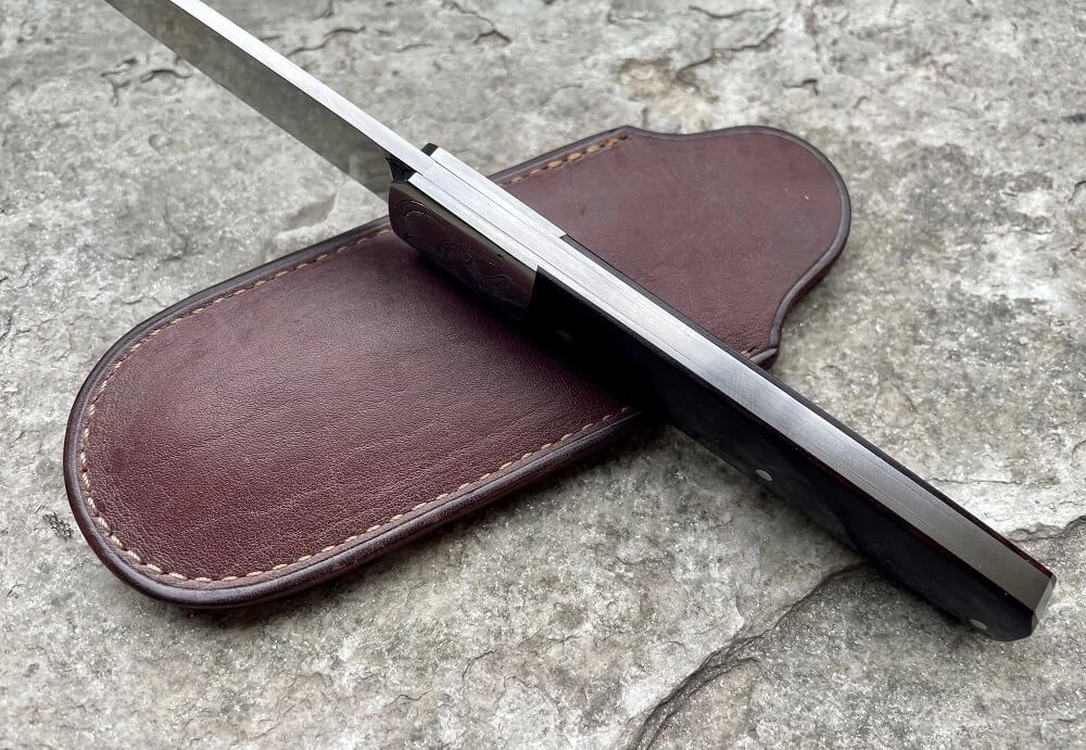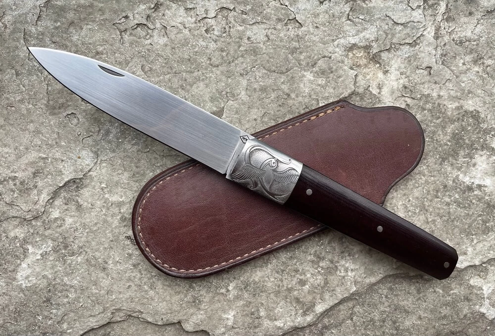 Couteau de Franck Souville, modèle Gentleman. Lame de 8.9cm en acier carbone 14C28N, finition satinée. Manche avec mitres gravées par Elisabeth Justa (motif avec oiseau) Ressort et platines en acier inox Z40. Plaquettes en micarta brun. Cran forcé. Longueur totale 20cm. 101g. Réalisé artisanalement par la coutellerie aux Forges d’Antan.