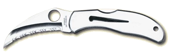 Lame de 73mm en forme en griffe avec serrations, acier ATS-55 (59-60 HCR). Manche en acier inox.