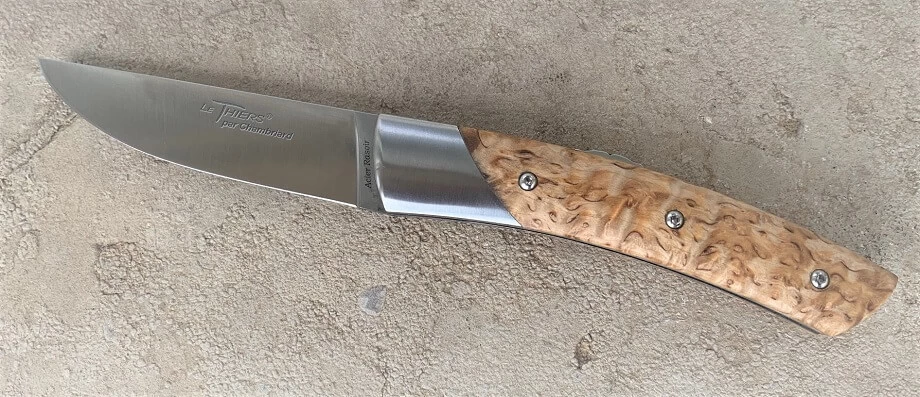Couteau Trappeur de Chambriard. Lame de 9cm. en acier inox 12C27 rasoir. Manche en bouleau. Mitres en acier inox satiné. Système de blocage à pompe. Ressort guilloché. Longueur totale 22cm. Poids 152g. Livré avec étui cuir (couleur selon dispo). Très joli modèle pour usages “outdoor”.