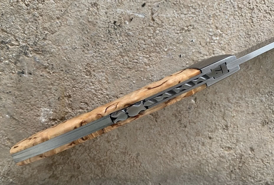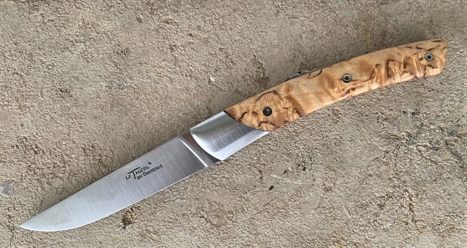 Couteau Thiers Chambriard Mi-Jo. Lame en acier rasoir inox de 8.2cm. Manche avec mitres en inox satiné avec plaquettes en bouleau de norvège. Ressort guilloché. Cran à pompe. Longueur totale 19cm. Un couteau par la coutellerie Chambriard.