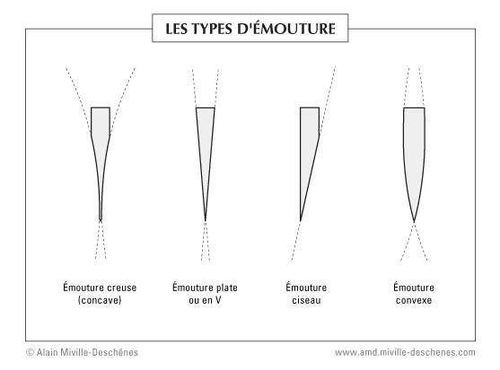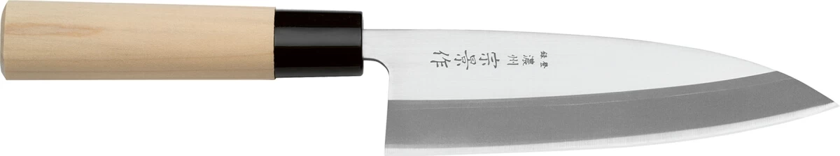 Lame de 16.5cm en acier inox 420JS (55 HRC) aiguisée en ciseaux (voir image). Manche en maple wood. Couteau à émincer. Léger et tranchant. Utilisation pour droitier uniquement.