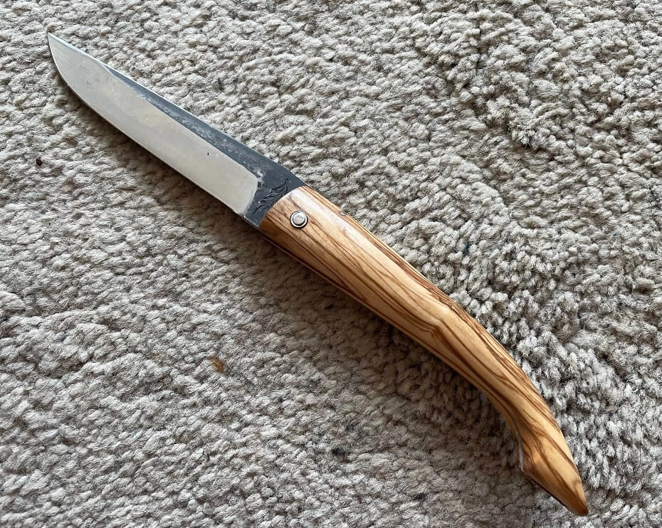 Viale José, modèle Capulagui olivier. Lame en acier XC75 brut de forge de 9.8cm. Manche en olivier. Couteau à friction (2 clous). Longueur totale 22cm. Création de la coutellerie des Oliviers dans le 06 en France.