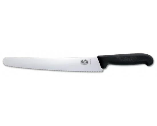 Couteau pour pâtissier produit par Victorinox avec lame dentée et bout arrondi de 26cm en acier inox. Manche en Fibrox.